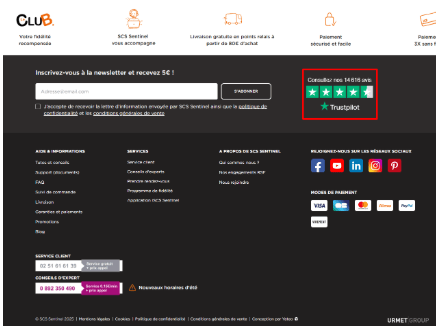 - Pour les avis clients, nous avons mis en place la solution TrustPilot, leader sur le marché des agrégateurs d'avis et partenaires. Les avis clients sont une donnée de réassurance nécessaire pour améliorer le taux de transformation, et doivent être présent de manière transversale à toutes les étapes du tunnel de conversion.