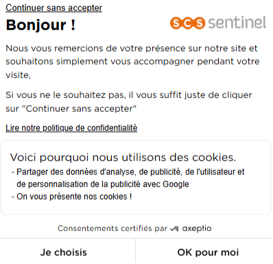 En tant que partenaire Axeptio, YATEO a intégré le module de gestion de consentements de manière personnalisée (bandeau, préférences, cookies, multilingue).