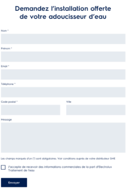 Le formulaire de contact, étape critique dans le tunnel de vente d'Electrolux, a été, lui aussi, simplifié au maximum, avec uniquement les champs nécessaires à remplir. De plus, des fonctions d'auto-remplissage ont été mises en place pour faciliter son remplissage.